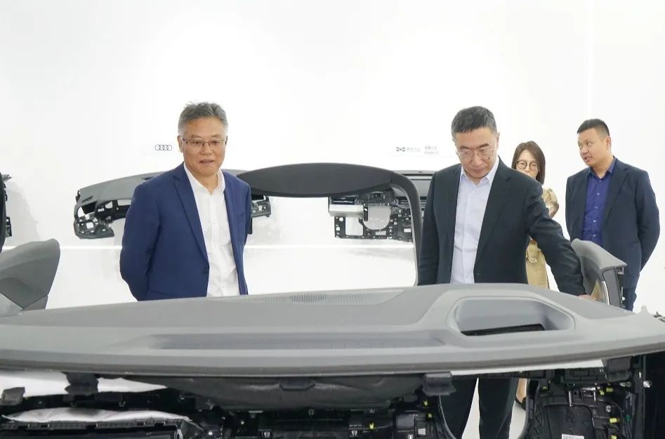 朱江明董事长及常熟市委领导等人详细了解了常熟汽饰集团的发展历程、产品研发及一体化能力。朱江明董事长对常熟汽饰集团最新研发的第三代智能座舱表示了肯定,对其隐藏式移动滑轨进行探讨交流,同时也提出了宝贵的意见和建议。